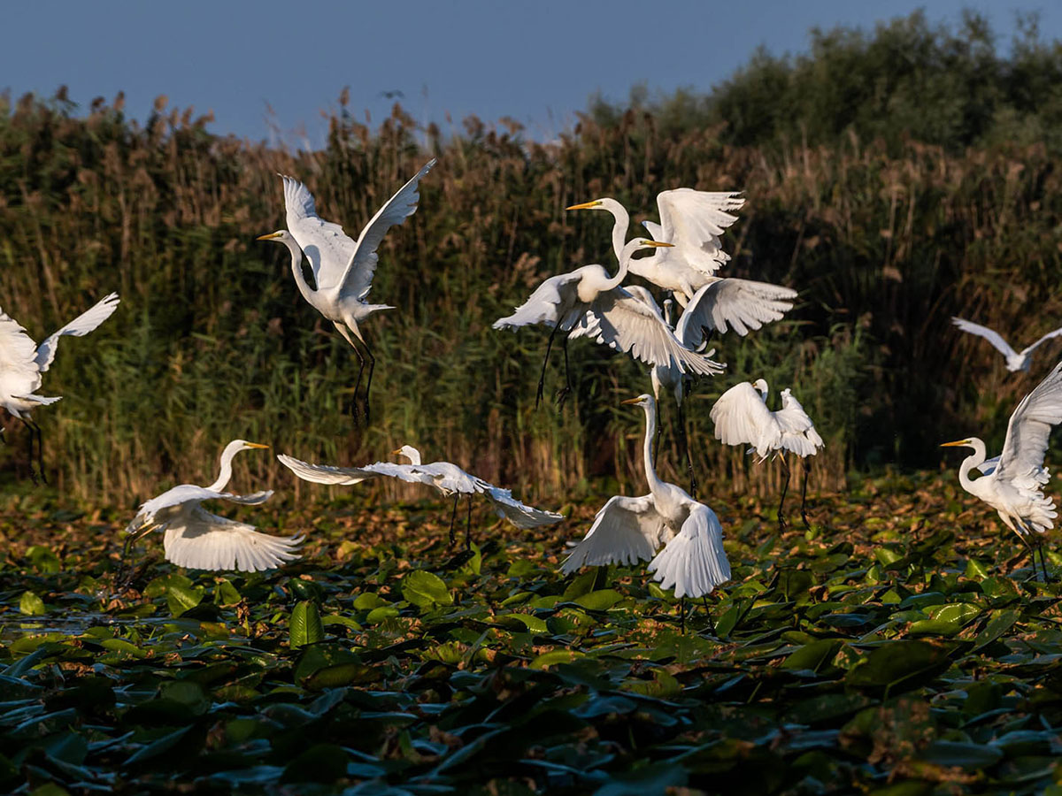 The Danube Delta has a fascinating landscape where over 320 species of birds can be observed, including great white egrets and little egrets.