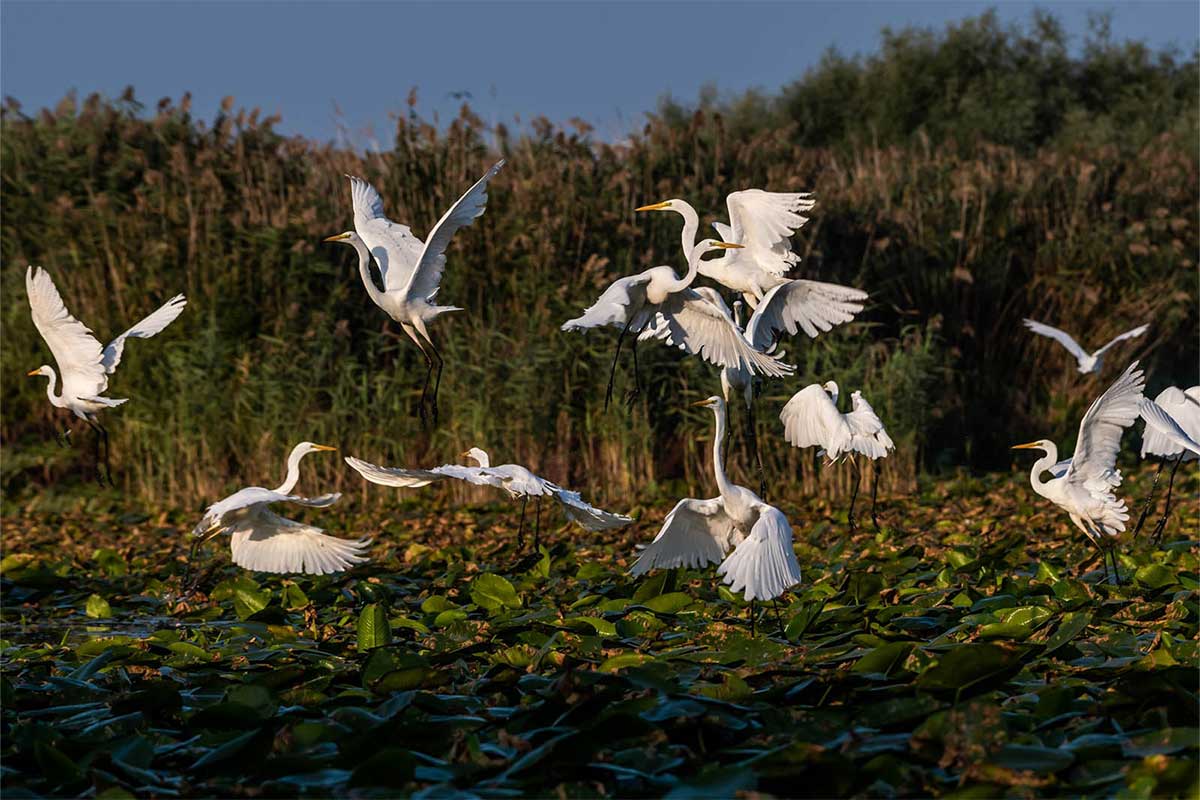 Delta Dunării are un peisaj fascinant, în care pot fi observate peste 320 de specii de păsări, printre care egrete argintii și egrete albe.
